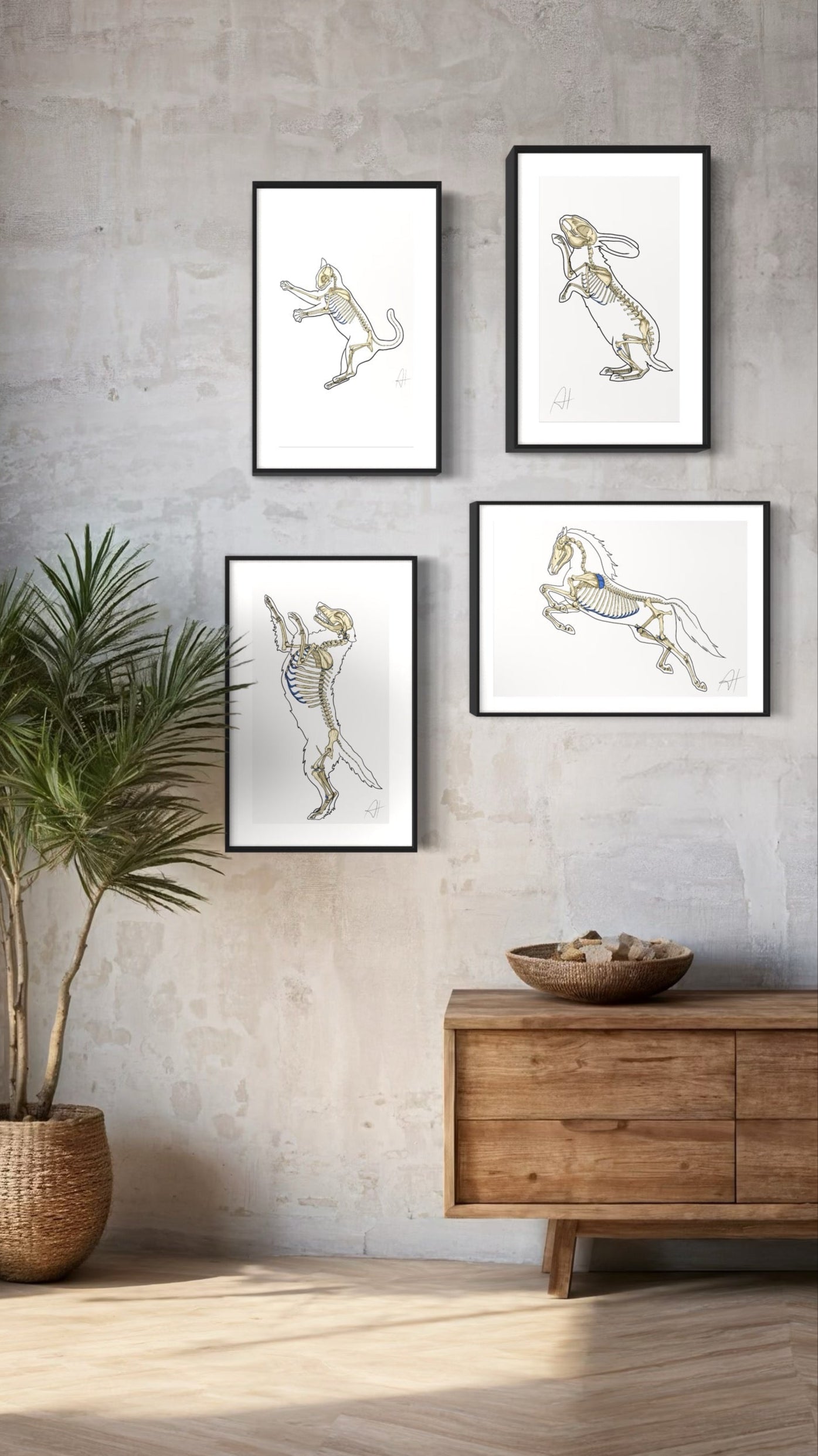 Dessinée à la main, par mes soins, cette affiche anatomique représente le squelette en mouvement du lapin. La position dynamique est idéale pour visualiser tous les os et mieux comprendre la biomécanique (et puis c'est sacrément stylé).