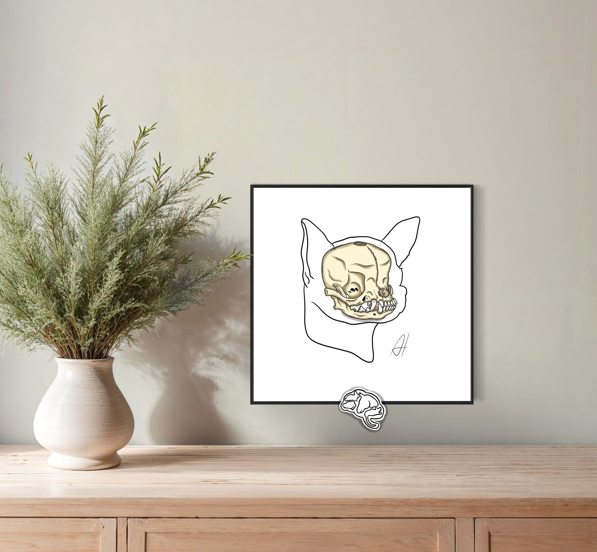Dessinée à la main, par mes soins, cette planche anatomique permet de mettre en lumière le type de crâne "en pomme" tel que le Chihuahua.